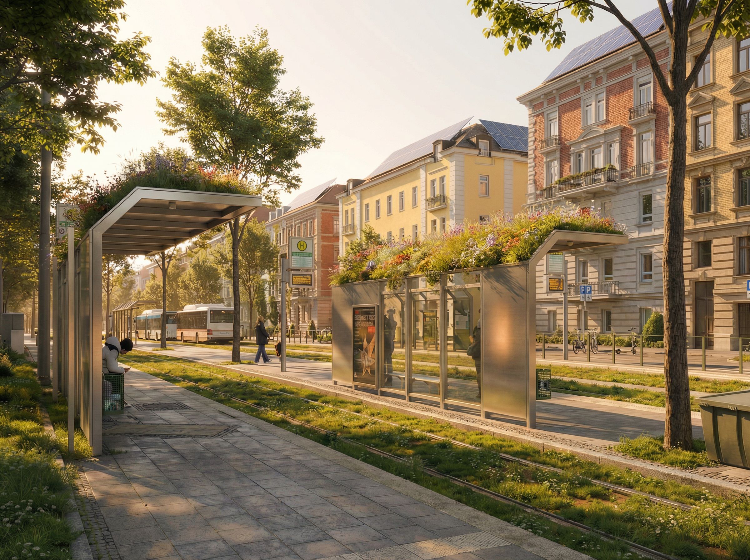 Wir finden, dass das Warten an Bus- und Tramhaltestellen doch so viel angenehmer sein könnte, wie hier am Theodor-Heuss-Platz. Begrünte Dächer und Flächen spenden Schatten, kühlen den Stadtraum, verbessern die Luftqualität und bieten gleichzeitig Regenschutz. Vergleichsweise wäre das ein kleiner Eingriff, der den öffentlichen Raum aufwerten und Klimaschutz im Alltag spürbar macht.