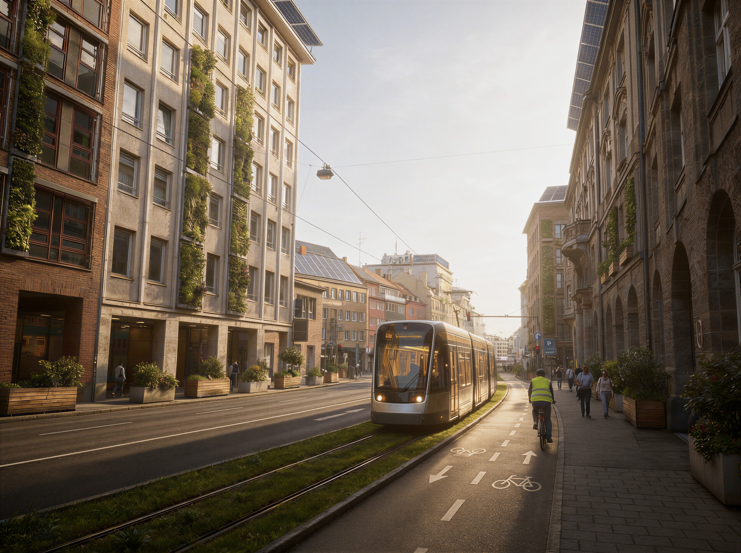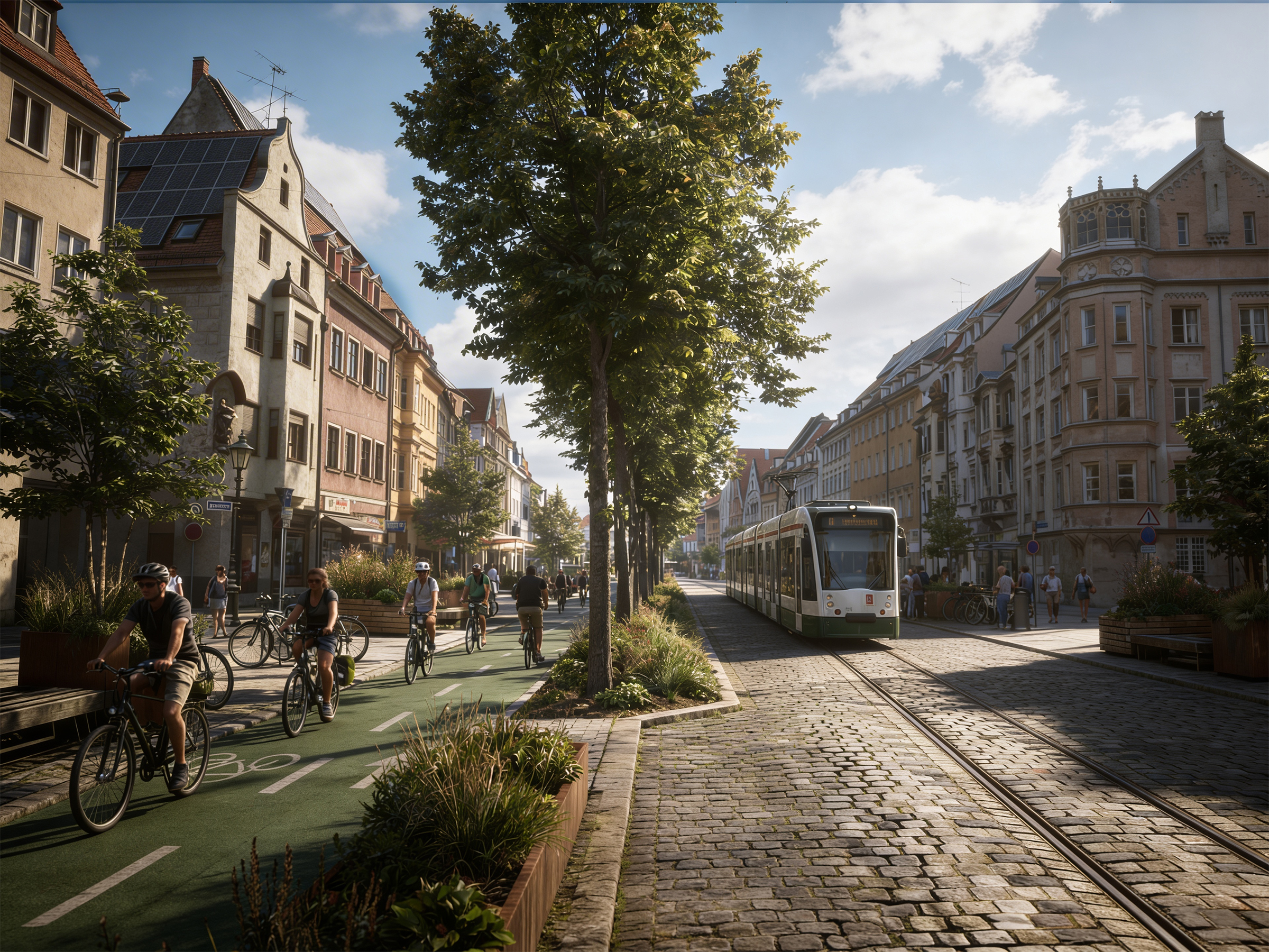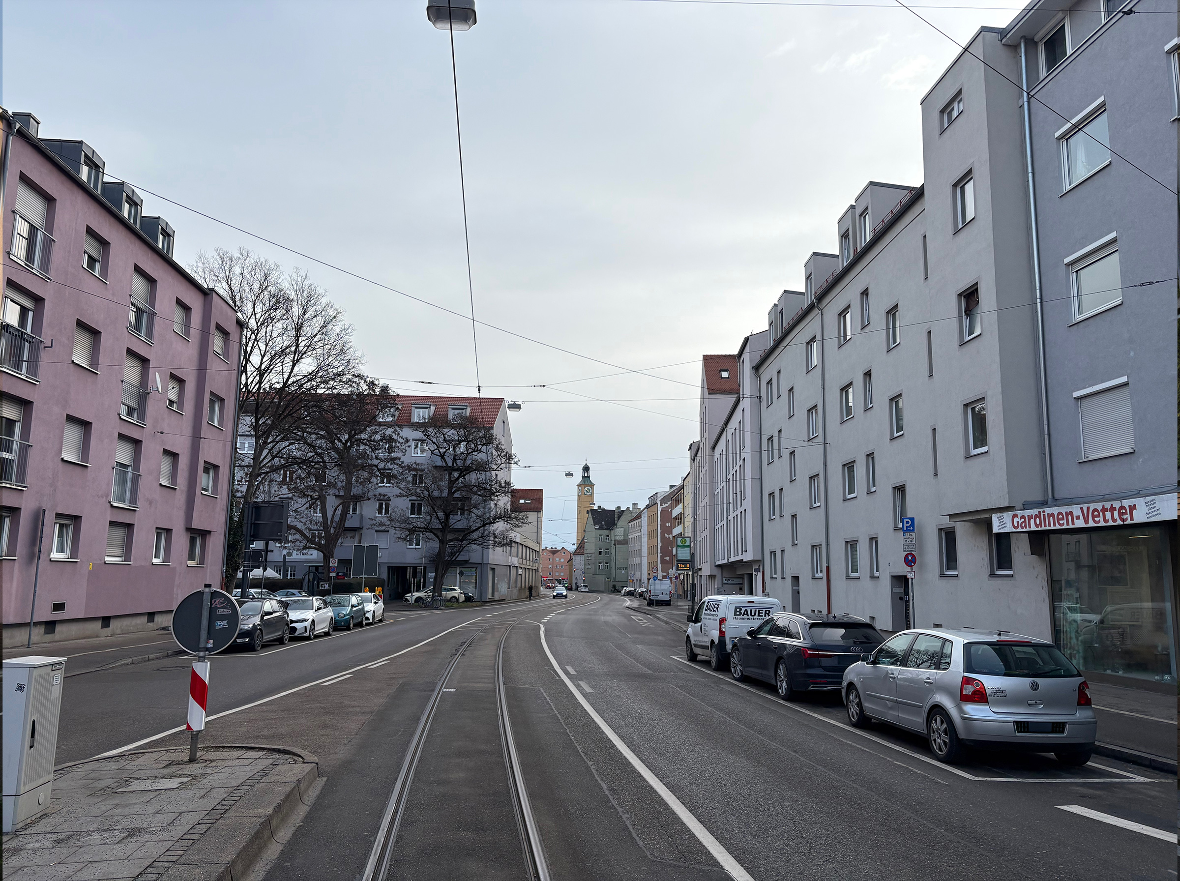Wo heute vor allem Verkehr in Augsburg dominiert, sehen wir konkret Potential für mehr Platz für Tram, Bus und Rad – mit Grünstreifen, sicheren Wegen für Rad- und Fußverkehr und Straßen, die leiser, kühler und lebenswerter wird.
