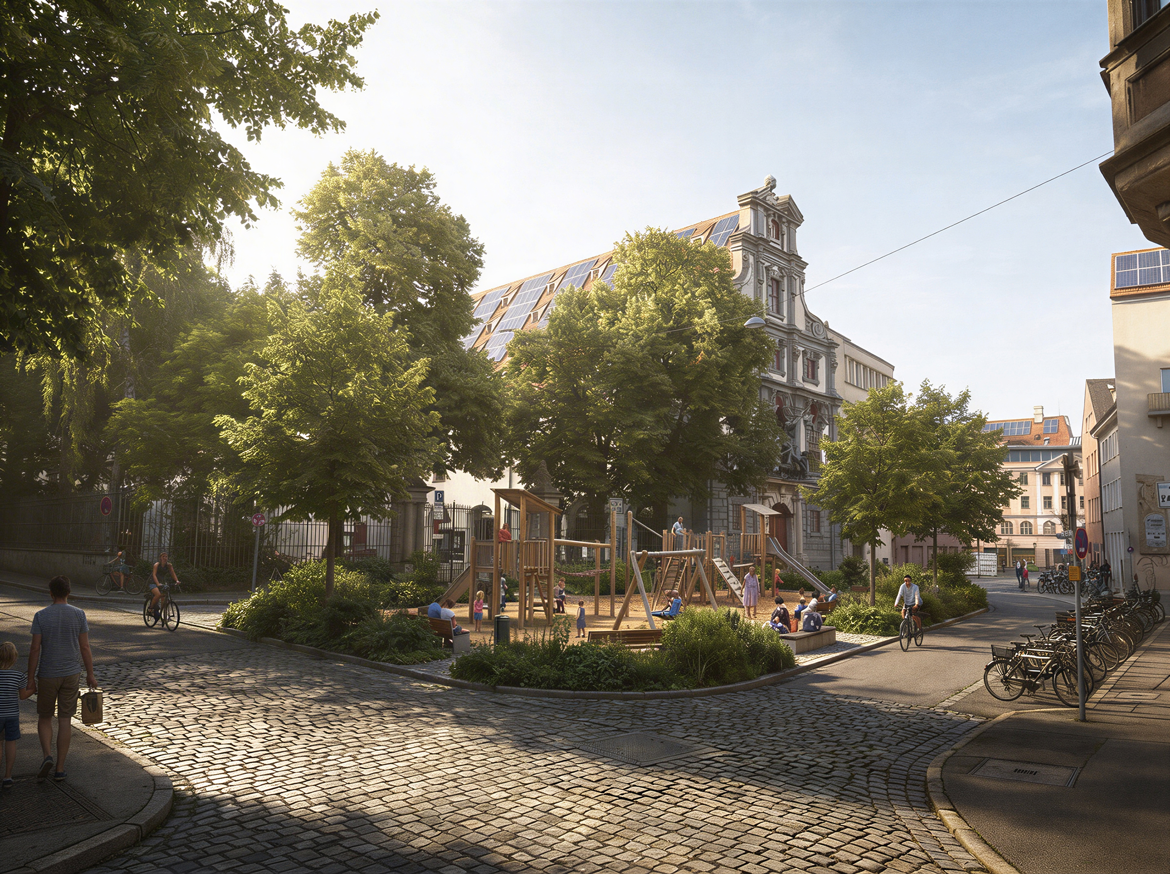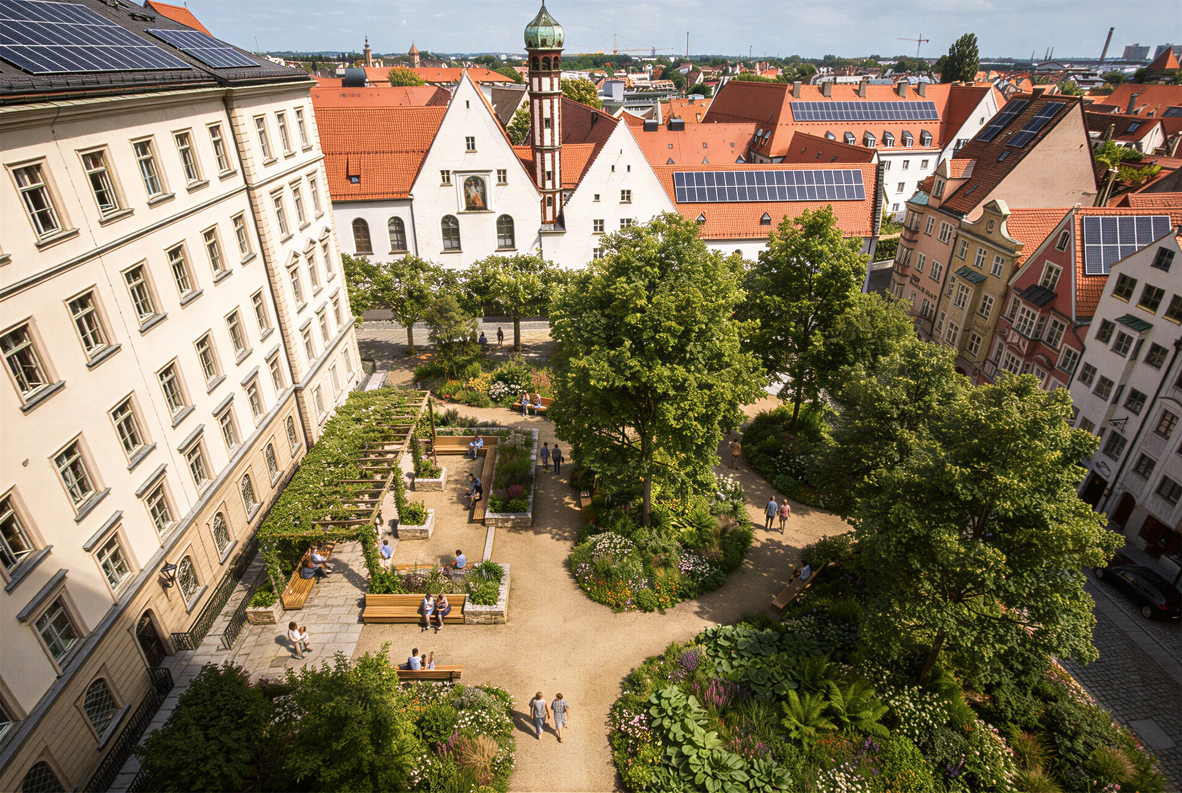 »Was wäre, wenn Augsburg mehr Raum zum Durchatmen hätte? Grüne Plätze statt Hitzeinseln, Straßen, die zum Begegnen einladen, blühende Dächer, eine Innenstadt, in der sich auch Kinder spielend bewegen können, Menschen sich treffen und Mobilität leise funktioniert. Diese Bilder zeigen, wie Augsburg aussehen kann, wenn wir den Mut haben, groß zu denken. Und Grün zu wählen.«